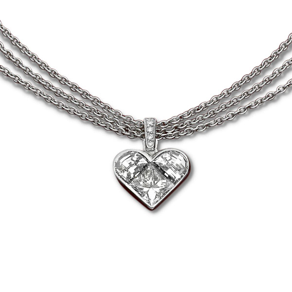 An 18k white gold pendant (8.5g) with three diamonds forming a heart for a total of 1.40 carats. The diamonds have been cut and adjusted with extraordinary precision to create the impression of a spectacular 3-carat stone. This pendant is suspended from a diamond-studded bow on a triple round cable chain, also in white gold.