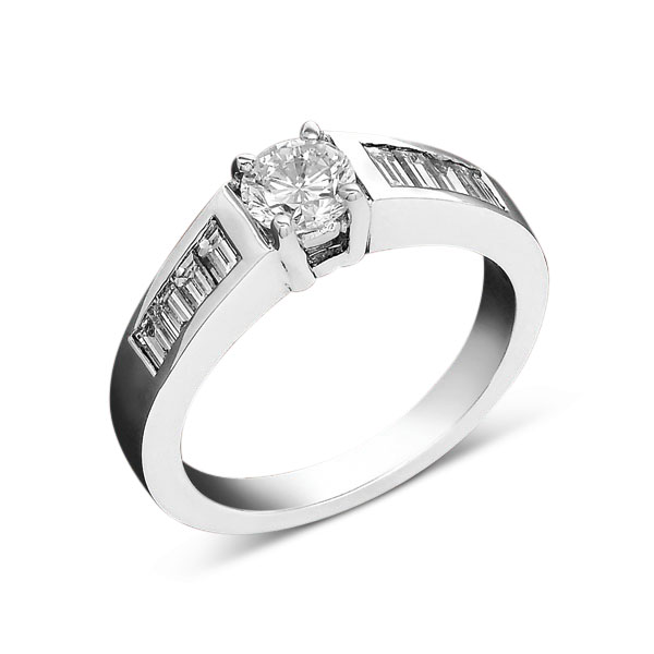 An 18k white gold ring weighing 6.5gr. In its center, a round brilliant-cut diamond of 0.30 carat in H color and SI clarity, set with four beaded prongs and 8 baguette-cut diamond side stones in a channel setting on a flat shank. Like all our rings, this classic engagement ring is proposed in white gold, yellow gold or pink gold. Also, if you wish so, it can be set with a diamond of a different size or quality, chosen among our wide selection of certified stones. As part of its service, Gottesman-Paris will be happy to advise you, either online or in the showroom.