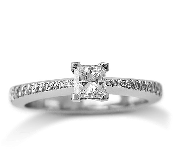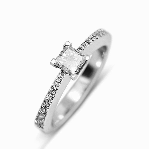 An 18k white gold mount weighing 6.5g In its center, a princess-cut diamond of 0.30 carat in H color and SI clarity set with four prongs and 20 round diamonds side stones. Like all our rings, this classic engagement ring is proposed in white gold, yellow gold or pink gold. Also, if you wish so, our bespoke jewellery workshop can set this engagement ring with a diamond of a different size or quality, chosen among our wide selection of certified stones. As part of its service, Gottesman-Paris will help you choose the perfect diamond to match your preference and price range, either online or in the showroom.