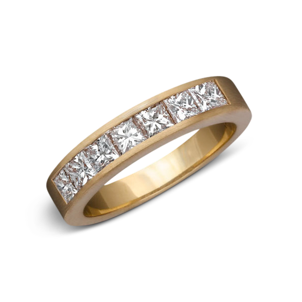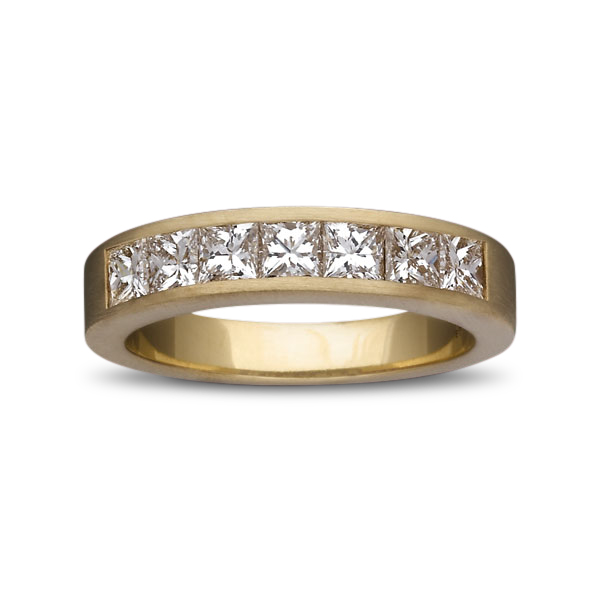 Hand-crafted in the finest tradition, this wedding ring in 18k yellow gold (6g) is channel-set with seven G VS princess-cut diamonds for a total of 1.18 carats. Different gold colours and polishes are also proposed. A ring of this quality is the perfect symbol of the eternal bond of marriage. As part of its service, Gottesman-Paris adapts to your price range and invites you to choose the size and number of diamonds in your ring.