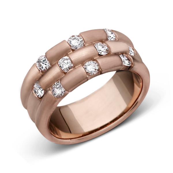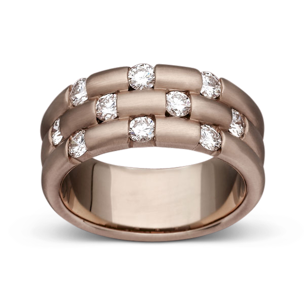 Alliance en or rose 18k poli mat d'un poids de 12gr avec 10 diamants brillants d'un poids de 0,76 carats. Ce modèle d'alliance originale figurant trois anneaux endiamantés est entièrement façonné par la main du joaillier dans le respect de la tradition artisanale. Vous avez aussi le choix de la couleur et du poli de l'or. Ces critères de qualité confèrent à votre bijou la promesse d'éternité liée au mariage. Pour être en accord avec votre budget, Gottesman-Paris vous offre la possibilité de choisir le poids et le nombre de diamants.