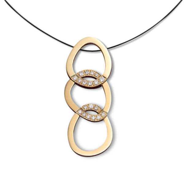 Pendentif en or jaune 18k d'un poids de 8.20gr signé Gottesman-Paris composé de trois motifs Trianon imbriqués, articulés et sertis de 19 diamants brillants d'un poids de 0.34 carat. Il est traversé par un cordon de la couleur de votre choix. Notre atelier sur mesure vous offre le choix de la couleur et du poli de l'or.