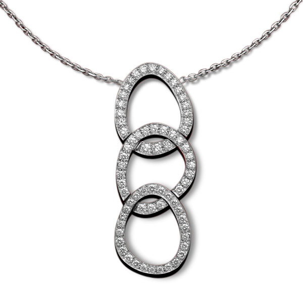 Ce pendentif en or blanc 18k d'un poids de 9.8gr et signé Gottesman-Paris est composé de trois motifs Trianon imbriqués, articulés et intégralement sertis de 70 diamants brillants d'un poids de 1.10 carat. Il est suspendu à une chaîne forçat diamantée. Notre atelier sur mesure vous le propose en différentes couleurs et polis d'or.